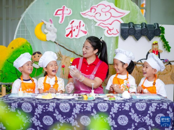 9月25日,在江苏省泰州市姜堰区第三实验幼儿园,小朋友们在老师的指导下学习做月饼。