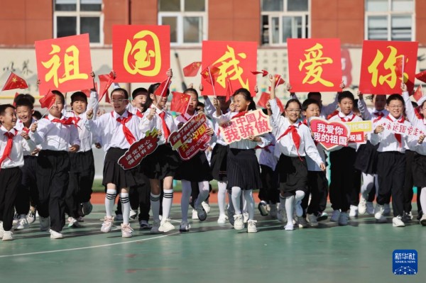 9月25日,在山东省临沂市沂南县,第三实验小学的小学生们参加“祝福祖国”活动。