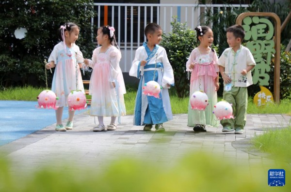 9月25日,在江苏省苏州市姑苏区平润实验幼儿园,小朋友提着自制中秋花灯欢乐游园。