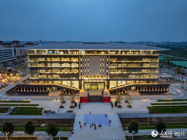 图书馆总建筑面积约6.8万平方米,建筑高度42.3米,分为地上七层、地下二层。设计藏书量约150万册,可提供阅览座席约3500个。人民网记者 张武军摄