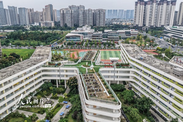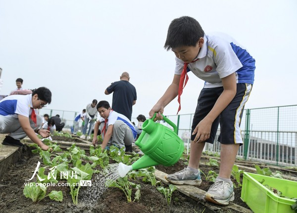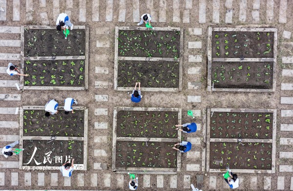 该校“空中农田”建于2021年,每个班级管理一块“责任田”,让学生和家长共同参与播种管理。李向雨摄(人民图片网)