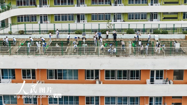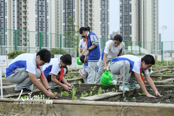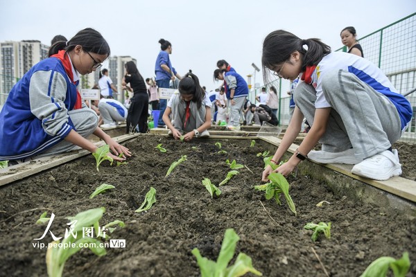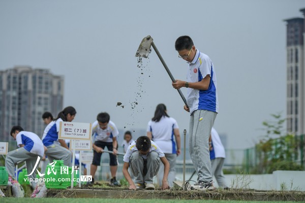 2025年9月30日,四川省成都市中和中学初中部安和校区的学生在教学楼楼顶“空中农田”开展秋季蔬菜播种劳动实践活动。