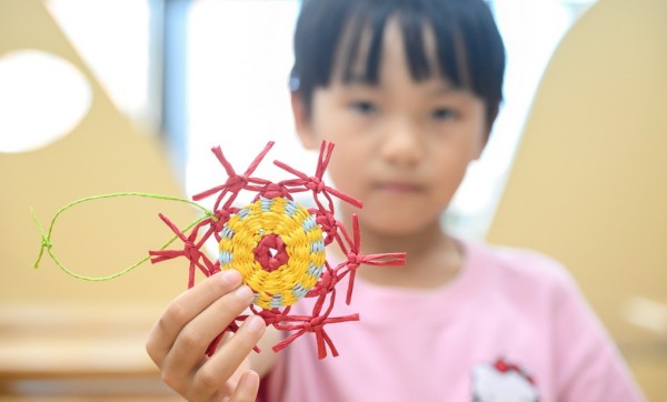 10月12日,在海南省文化馆,小朋友展示自己的东山草编技艺作品。