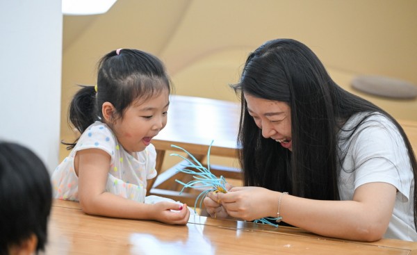 10月12日,在海南省文化馆,东山草编技艺传承人袁洁(后)为家长和小朋友讲解东山草编技艺。