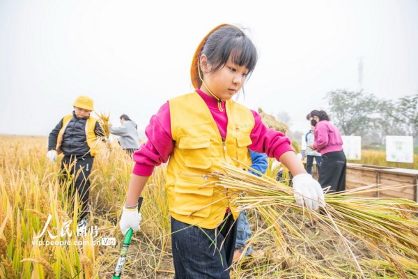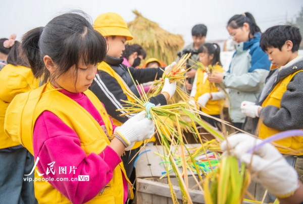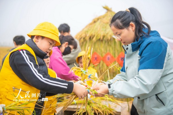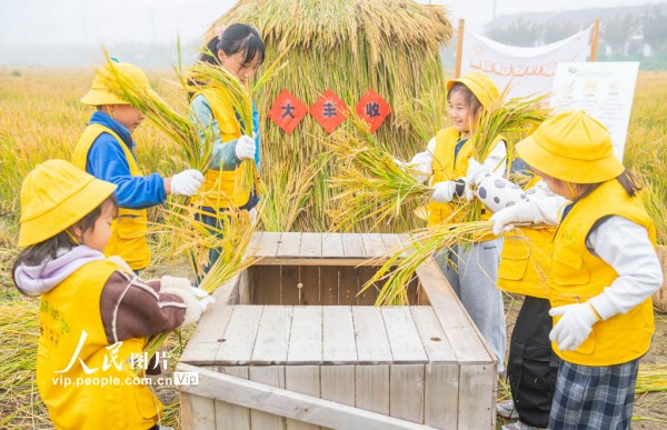 2025年11月1日,江苏省宿迁市宿城区蔡集镇牛角村举办“稻田文化 秋收课堂”研学活动,小朋友们通过参加稻谷知识小课堂、体验收割、脱谷、扎稻草人、小火车游稻田等环节,感受劳动的艰辛和丰收的喜悦。徐江海摄(人民图片网)