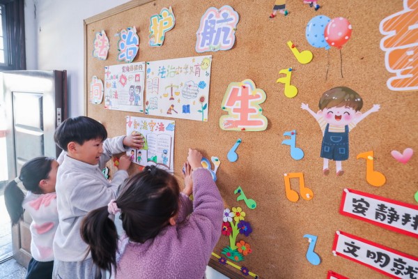 12月9日,诸暨市暨南街道中心学校王家井小学的学生把自己创作的法治宣传画贴到教室的宣传栏中。