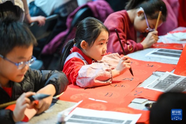 1月24日,在天津市少年儿童活动中心,小朋友在娃娃庙会上写春联。