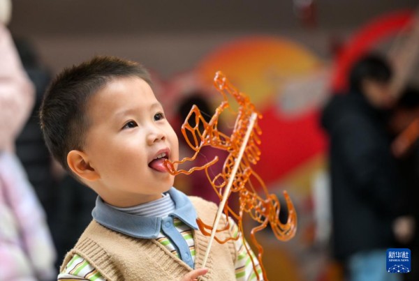 1月24日,在天津市少年儿童活动中心,一名小朋友在娃娃庙会上吃糖画。
