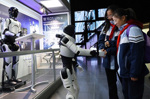 1月27日,参观者在上海科技馆“明日行者”展区内与机器人握手互动。
