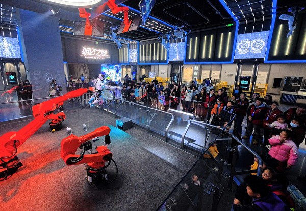 1月27日,参观者在上海科技馆“明日行者”展区内观看机器人表演。