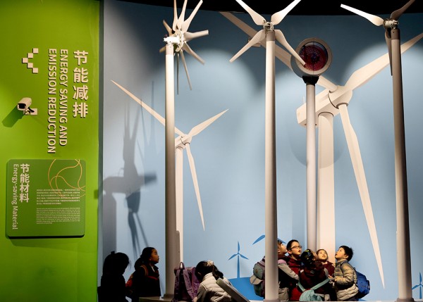 1月27日,小朋友在上海科技馆“源动未来”展区内一组风电模型下参观。