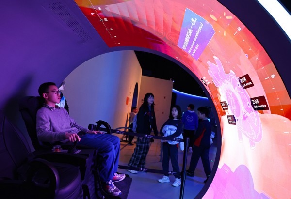 1月27日,参观者在上海科技馆“源动未来”展区内体验游戏互动科学装置。