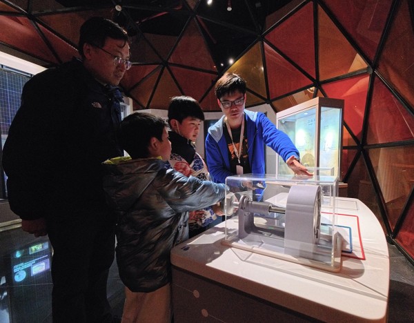 1月27日,工作人员(右一)指导参观者进行科学游戏体验。