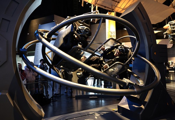 1月27日,参观者在上海科技馆“飞行探秘”展区内体验乘坐四轴平衡器。