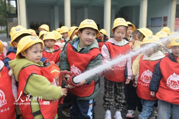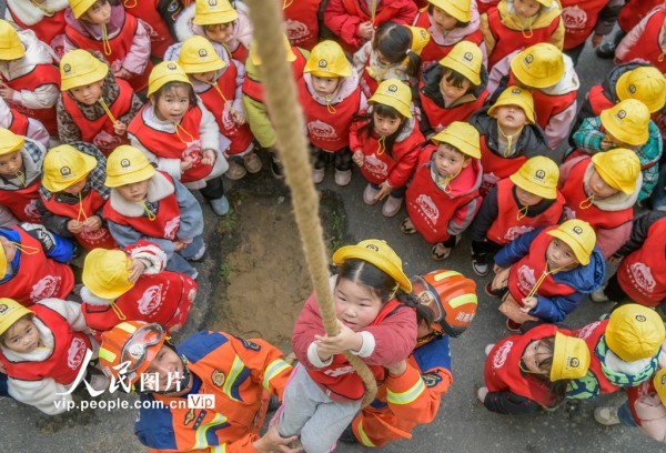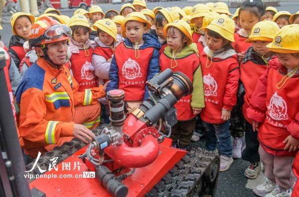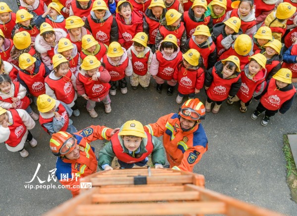 2026年3月4日,湖南省永州市道县中小学、幼儿园迎来开学。道县消防救援大队邀请幼儿园小朋友们走进消防营区开展“开学第一课”安全教育主题活动,通过学习消防安全知识、体验绳索攀爬技能和操作消防水枪等互动环节,提升孩子们的安全意识和应急避险能力。蒋克青摄(人民图片网)