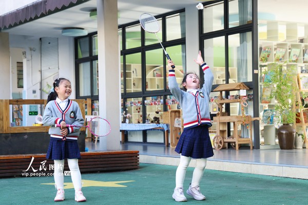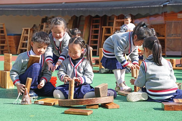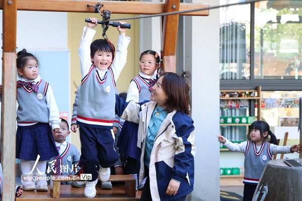 2026年3月11日,浙江金华磐安县实验幼儿园,小朋友们在户外活动场进行搭积木、打羽毛球、玩滑索等自主游戏。陈强摄(人民图片网)