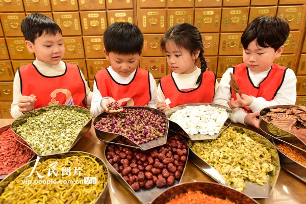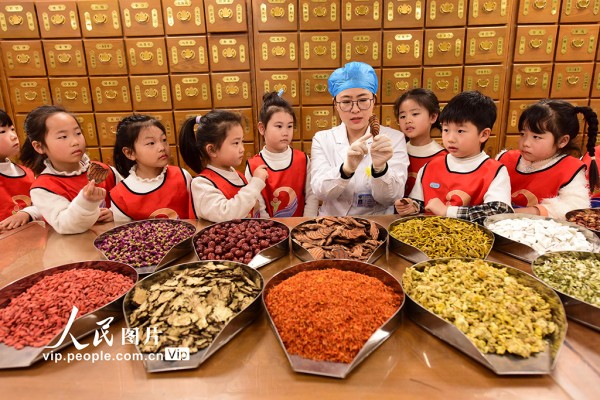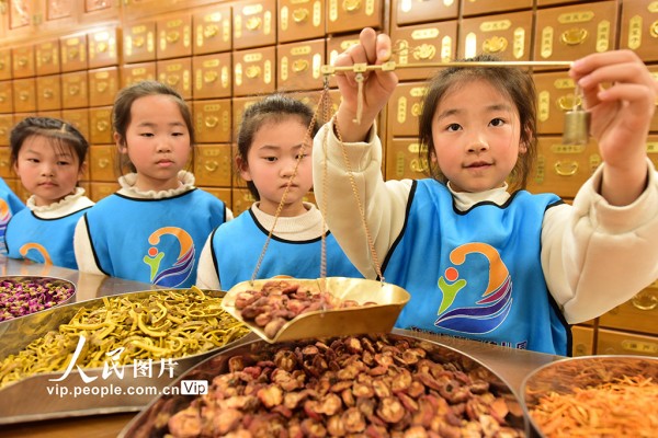 2026年3月16日,江苏连云港东海县第三幼儿园开展“体验国医文化 感受国药魅力”课外实践活动。小朋友们走进中医院,通过辨识中药材、体验饮片配伍、参与药材炮制等环节,亲身感受了中医药传统文化的博大精深。张玲摄(人民图片网)