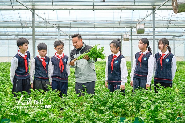 2026年4月3日,在安徽合肥庐阳区三十岗乡崔岗村喜鹿农场,合肥市古城小学的学生正在大棚里帮助农户采摘蔬菜,学习种植知识。春假期间,古城小学组织开展了“下乡助农忙,劳动促成长”主题活动。学生们走进田间地头,学习种植技术,参与蔬菜瓜果的采摘、分拣,在劳动体验中收获知识与成长。赵明摄(人民图片网)